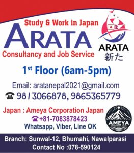 सुनवल नगरपालिका वडा न. १२ भुमहिमा जापान भासामा स्टुडेन्ट एबम वर्किङ भिसाको लागि भासा सिकाउने र भिसाको लागि आफ्नै कन्सल्टेन्सी बाट जापानको लागि प्रोसेस गर्नको लागि सजिलो होस भन्ने हेतुले मिति 2080/10/26 गते आराता कन्सल्टेन्सी एन्ड जब सर्भिस जापान अफिस को सुभारम्भ भयो उक्त कार्यक्रम वडा अध्यक्ष श्री दिपक पौडेलको प्रमुख आथित्यता रिबन काटी सुभारम्भ भयो भने कन्सल्टेन्सिका प्रोप्राइटर राज पान्डेय र अनिल क्षेत्रीले मुख्य उद्देस्य माथी प्रकाश पार्दै अबका दिनमा यस क्षेत्रका ब्यक्तिहरु धेरै टाढा जानु नपर्ने साथै जापानमा पनि आफ्नै आमेया कर्पोरेसन जापान रहेकोले कामदार र स्टुडेन्टलाइ सुनौलो अबसर रहेको जानकारी दिनुभयो भने बर्दघाट देखि सुनवलका स्थानियको उल्लेख्य उपस्थितिमा कार्यक्रम लेखनाथ न्यौपाने ज्यूले सन्चालन गरेको प्रोपराइटर राज पान्डेयले जानकारी दिनु भयो।