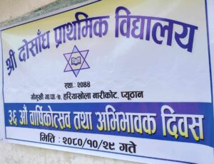दाेसाँध प्राथमिक विद्यालय गाैमुखी गाउँपालिका वडा नं ७ हरिया खाेला नारिकाेटकाे ३६औ वार्षिकाेत्सव तथा शिक्षक अभिभावक दिवस आज सम्पन्न भएको छ।गाैमुखी गाउँपालिका उपाध्यक्ष महावीर रानाकाे प्रमुख आतिथ्यतामा,गाैमुखी गाउँपालिका ७नं वडाका वडा अध्यक्ष काेमल पुरी र निवर्तमान वडाध्यक्ष श्यामलाल पुरीकाे बिशेष आथित्यतामा भएको कार्यक्रममा अध्यक्षता शुकमाया वि.क.ले ,स्वागत भाषण शिक्षक पित्रीभक्त रिजालले र संचालन नारायण बहादुर जि.सी.ले गर्नु भएको थियाे।विद्यालयका प्र.अ.जुद्व बहादुर जि.सी.ले वार्षिक तथा आर्थिक प्रतिवेदन प्रस्तुत गर्नु भएकाे थियाे।