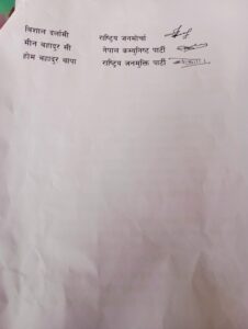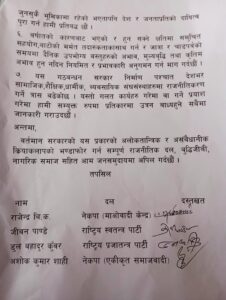 ज्ञापनपत्रमा राष्ट्रिय जनमोर्चाका जिल्ला अध्यक्ष विशाल दर्लामी, नेकपा (माओवादी केन्द्र) का राजेन्द्र विक, राष्ट्रिय स्वतन्त्र पार्टीका जीवन पाण्डे, राष्ट्रिय प्रजातन्त्र पार्टीका डुलबहादुर कुँवर, नेकपा (एकीकृत समाजवादी) का अशोककुमार शाही, नेपाल कम्युनिस्ट पार्टीका मीनबहादुर सी र राष्ट्रिय जनमुक्ति पार्टीका होमबहादुर थापाको हस्ताक्षर रहेको छ ।