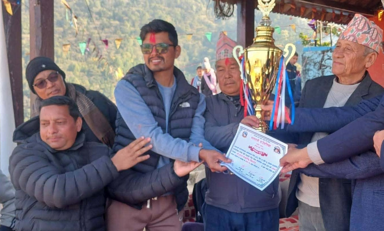 समापन समाराेहमा गाउपालिका अध्यक्ष कृष्ण बहादुर खड्काले विजेता टिमलाई पुरस्कार तथा प्रमाणपत्र हस्तान्त्रण गर्नुभयकाे छ ।