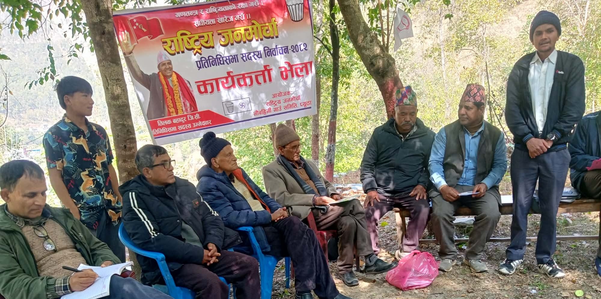 राष्ट्र, राष्ट्रियता जोगाउन समग्र प्युठानको बिकास निर्माणका लागि अनुभवी बिकासप्रेमी नेता तिलक जिसीलाई जिताउन सबै कार्यकर्ता सक्रियताका साथ लाग्न आग्रह गर्नुभयाे। उहाँले राष्ट्रिय जनमोर्चाको पक्षमा माहोल बन्दै गएकोले आम जनतालाई गोलबन्द गरेर चुनावको माहोल राष्ट्रिय जनमोर्चाको वरिपरि राख्न आग्रह गर्नुभयो। देशको बैकल्पिक राजनीतिक शक्ति राष्ट्रिय जनमोर्चा मात्र भएकोले गिलासमा मतदान गर्न गराउन कार्यकर्तालाई आग्रह गर्नुभयो।