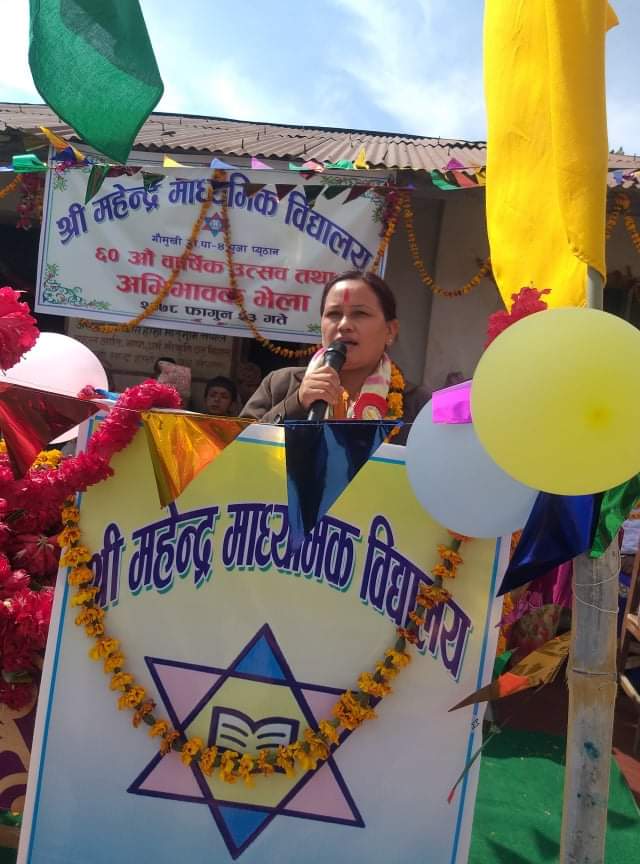 पार्टीको प्रतिनिधि भएर प्रदेशसभामा प्रतिनिधित्व गरेपछि आफुले सकेजति पिछडिएको याे क्षेत्रमा विकास निकासमा विशेष ध्यान दिएकाे बताउदै महेन्द्र माविकाे पूर्वाधार विकासमा लगातार याेजनाहरू विनियोजन गरेको र सम्पूर्ण गाैमुखीक्षेत्रकाे विकासकाे लागि पनि याेजनाहरू विनियोजन गराउन सफल भएको उल्लेख गर्नुभयो ।महिला नेतृ जिसीले हामीले संघीयता जस्ताे महंगो व्यवस्थामा प्रवेश ग-याै,सुरूमा नबुझे पनि अहिले याे व्यवस्था बाेझिलाे रहेछ,हटाउनु पर्छ भन्ने सबैको मन मनमा पुगेको छ,देशलाई संघीयताले असफल राष्ट्र तिर लगिरहेकाेछ भन्ने प्रष्ट भैसकेको छ।सामान्य खर्च समेत धान्न नसकेकाे देशकाे अवस्था र संघीयता कै कारण विकास निकासमा पनि गम्भीर अवरोध खडा भएकाे छ भन्नुभयाे।नेपालकाे शिक्षा स्तर उपयुुक्त नहुदा शैक्षिक जमात पलायन हुन बाध्य छ र शिक्षाक्षेत्रकाे भूमिका महत्त्वपूर्ण हुनसकेको छैन। व्यवहारिक ,प्राविधिक,सिपमूलक शिक्षा तिर शिक्षा क्षेत्र बढ्दैछ,यसकाे लागी महेन्द्र मावि उदारण बनाेस् र समाज रूपान्तरकाे दिशामा महत्त्वपूर्ण याेगदानकाे आशा सहित वार्षिक उत्सव सफलताको शुभकामना दिनुभयो ।