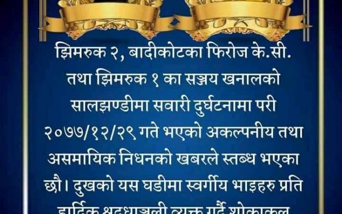 दिपेन्द्र सुनार प्युठान रुपन्देहीको सैनामैना नगरपालिकामा आइतबार सवारी दुर्घटना मा परि ज्यान गुमाएका प्युठान जिल्ला झिमरुक गा पा वार्ड न १ का सन्जय खनालको आज अन्त्यस्टी गरिएको छ। उनको आफनै जन्मस्थल मा पर्ने प्रतिष्ठित घाट टिमुले...