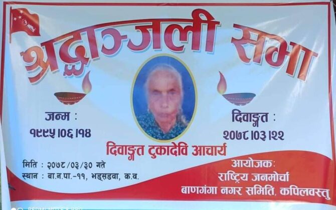 रिसव आचार्य ,कपिलवस्तु ।राष्ट्रिय जनमोर्चा बाण्गंगा नगर कमिटी को अयोजनामा बाणगंगा न पा ११ भड्सरहवामा शोक सभा सम्पन्न भएको छ।राष्ट्रिय जनमोर्चा का क्रियासिल सदस्य चिरञ्जीवी आाचार्य कि ममतामयि आमा टुकादेवि आचार्य को निधन प्रती...