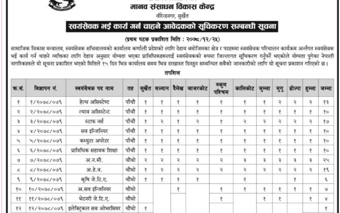 कर्णाली प्रदेश सरकारले स्वयंसेवक परिचालन कार्यक्रममा कर्मचारी भर्नाका लागि दरखास्त आह्वान गरेको छ। प्रदेश सरकारको सामाजिक विकास मन्त्रालयले हेल्थ अस्टिस्टेण्ट, ल्याब असिस्टेण्ट, स्टाफ नर्स, सबइन्जिनियर, कम्प्युटर अपरेटर, प्राविधिक सहायक (शिक्षा) अनमी, अहेव, कृषि (जेटिए), असवइन्जिनियर,...