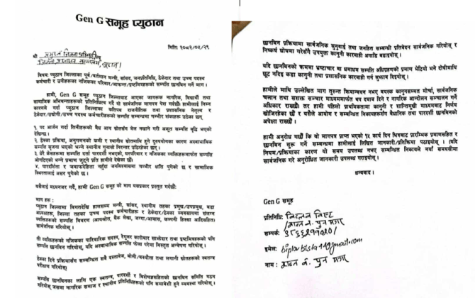 प्यूठान । जेनजी समुह प्यूठानले जनप्रतिनिधि, उच्च पदस्थ कर्मचारी, ठेकेदार र उनका आफन्तहरुको सम्पत्ती छानविन गर्न माग गरेको छ । प्रमुख जिल्ला अधिकारी समक्ष माग गर्दै १५ दिन भित्र छानविन सुरु भएको लिखित जानकारी...