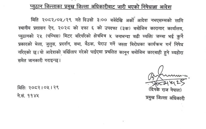 पुरा पढ्नुहोसप्यूठान । जिल्ला प्रशासन कार्यालय प्यूठानले प्यूठान कागागार क्षेत्र भित्र निषेधाज्ञा आदेश जारी गरेको छ । अर्को आदेश नभए सम्मका लागि कारागारको २५ मिटर वरपरको क्षेत्रभित्र निषेधाज्ञा गरेको हो । निषेधाज्ञाको समयमा ५ जना भन्दा...
