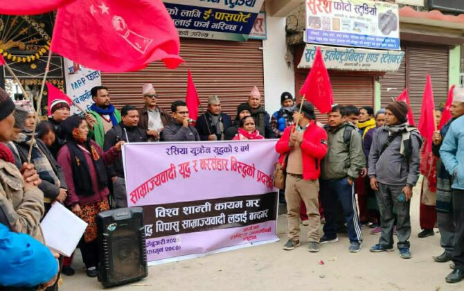 पुरा पढ्नुहोसफाल्गुन १२, प्युठान जुमान सिंह केसी रसीया युक्रेन युद्धको २ वर्ष पूरा भएको अवसरमा युद्ध विरुद्ध साम्राज्यवादी युद्ध र नरसंहार विरुद्ध प्युठानको खलंगामा प्रदशन भएको छ। बिश्व शान्ती कायम गर, युद्ध पिपासु साम्राज्यवादी लडाई बन्द गर भन्दै...
