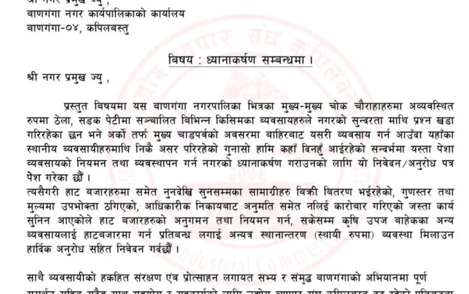 पुरा पढ्नुहोसउद्योग ब्यापार संघ कपिलवस्तु ले बाणगङ्गा का विभिन्न चोक चौराहा हरुमा अब्यबस्थित रुपमा ठेला तथा सडकपेटी मा ब्यापार ब्याबसाय गरि बैधानिक ब्याबसाय गरिरहेका स्थानिय ब्याबसायीहरुलाइ मार परेको सन्दर्भ सहित त्यस्ता ब्याबसाय को नियमन तथा...