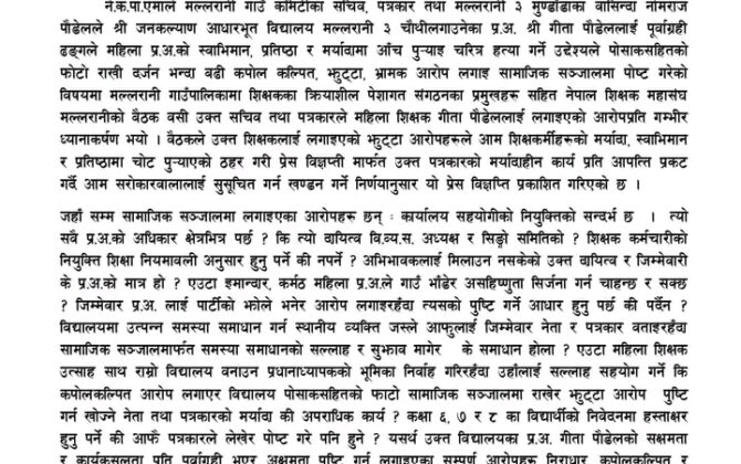 चैत्र २३, प्युठान मल्लरानी गाउँपालिका वडा न. ३ जनकल्याण आधारभुत बिधालयका प्रधानाध्यापक गिता पौडेललाई सामाजिक संजाल मार्फत पुर्वाग्रह राखी चरित्र हत्या गरेको नेपाल शिक्षक महासंघ मल्लरानी गाउँसमितिले आरोप लगाएको छ। बुधबार एक विग्यप्ती प्रकाशित गर्दै महासंघले...