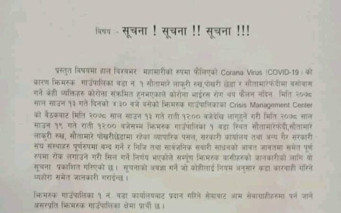 कोरोना भाइरस नियन्त्रण को लागि प्युठानको झिमरुक गा पा वार्ड न १ एक हप्ता लागि सिल