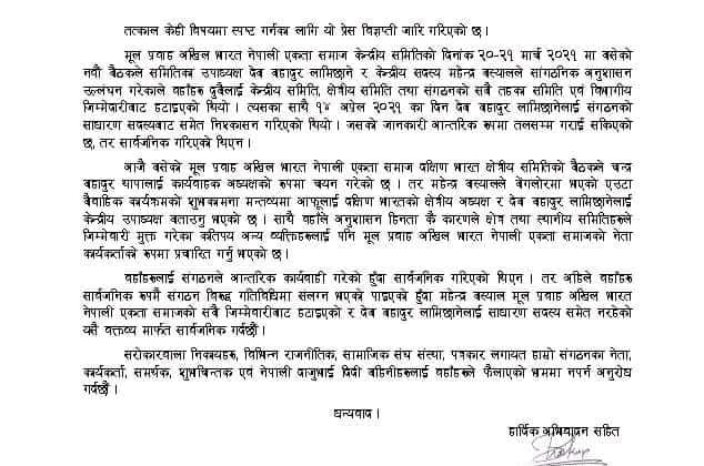 धनविर पुन : नयाँ दिल्ली, १८ अप्रेल । मूल प्रवाह अखिल भारत नेपाली एकता समाजका पूर्व उपाध्यक्ष देब बहादुर लामिछाने समाजले साधरण सदस्यबाट समेत निश्कानमा परेका छन् । लामिछानेले संगठनको नीति तथा अनुशासन विरुद्ध...