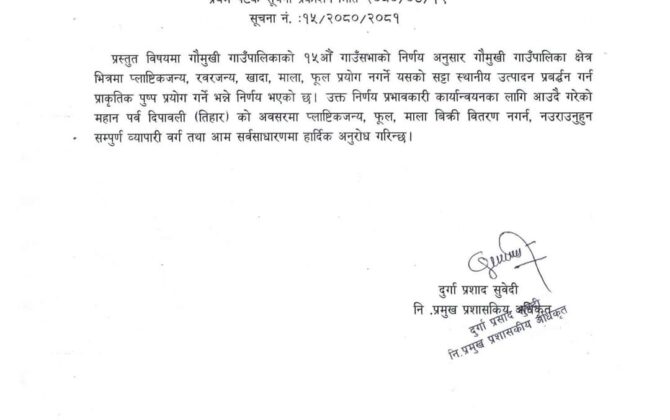 पुरा पढ्नुहोसजुमान सिंह केसी कार्तिक १९, प्युठान गौमुखी गाउँपालिका प्युठानले पलास्टीक जन्य फुलमाला प्रयोग नगर्न नगराउन अपिल गरेको छ। गाउँपालिकाको १५ औ गाउँसभाको निर्णय अनुसार गाउँपालिका भित्र पलास्टीक जन्य, रबरजन्य,खादा, फूलमाला, प्रयोग नगर्ने नगाराउने सम्बन्धमा भएको निर्णय...